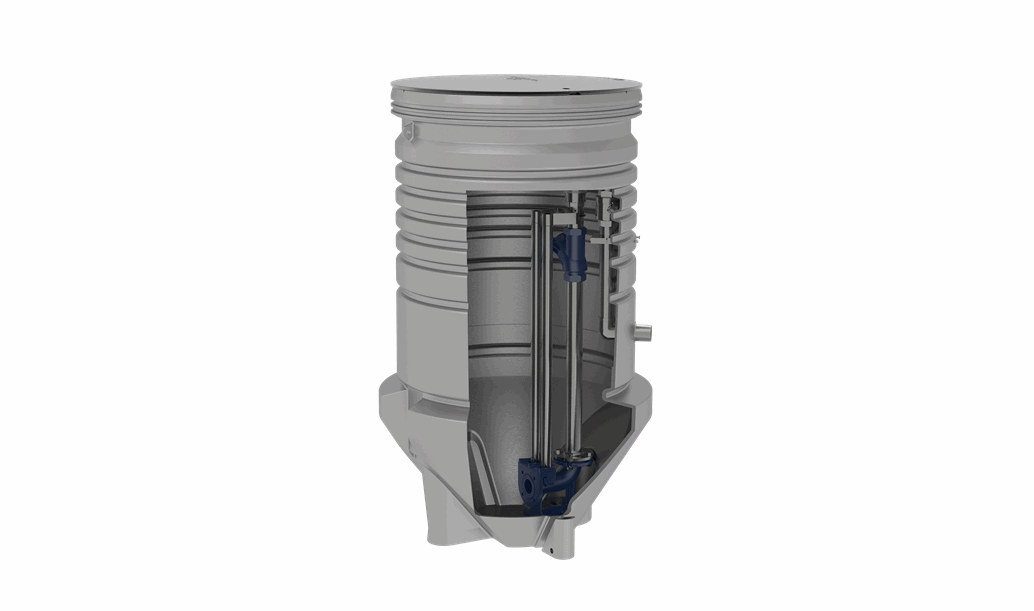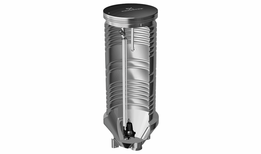 Резервуар имеет расширение в нижней части, для защиты от всплытия во время установки с высоким уровнем грунтовых вод. Вместе с тем, такая конструкция нижней части препятствует скоплению осадка. Доступ ко всем компонентам насосной станции возможен сверху. В резервуарах диаметром менее 1200 мм автоматическая трубная муфта устанавливается снизу без использования винтов. Можно снять муфту вместе с трубопроводом без доступа в колодец