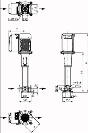 Высокоэффективный высоконапорный центробежный насос вертикального исполнения с линейными подсоединениями и интегрированным частотным преобразователем с воздушным охлаждением. Интегрированный частотный преобразователь позволяет изменять переменное давление и регулировать частоту вращения.